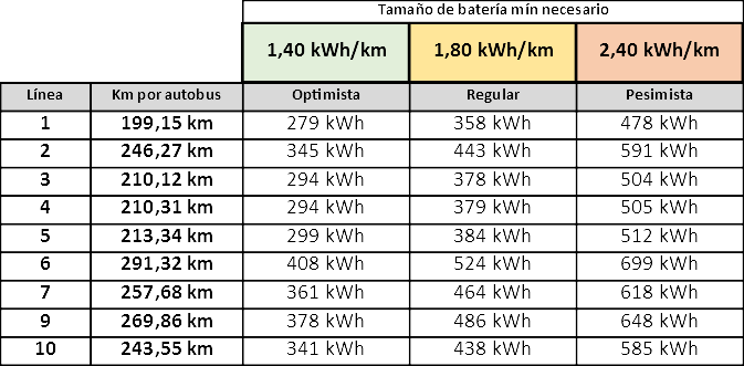 Teniendo en cuenta la orografía y clima analizados, se han considerado tres escenarios de consumo diferentes para establecer la necesidad de los autobuses con diferente energía embarcada en cada línea de transporte público de Ávila, sin necesidad de una recarga intermedia.