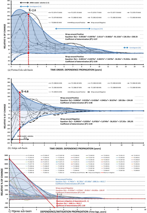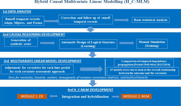 Este trabajo describe el desarrollo conjunto de dos métodos diferentes para la evaluación de la escorrentía temporal de rive?s. Esto se realiza a través de un enfoque híbrido por medio de Modelos Lineales Generales Multivariados (MGLM; inspirados en MLR como método estadístico), y Razonamiento Causal (CR; como no lineales). Esta innovadora aproximación metodológica, denominada Modelización Lineal Multivariante Híbrida (H-CMLM), tiene como objetivo principal potenciar el análisis del comportamiento de los registros hidrológicos temporales. El H-CMLM se ha aplicado con éxito a tres cuencas españolas diferentes (Adaja, Mijares y Porma) que fueron elegidas por sus características dispares. Los resultados se dividieron en cuantitativos y cualitativos. Los resultados numéricos muestran un nivel muy alto de equivalencia entre el valor medio de la dependencia temporal proporcionado por el módulo MLM y el comportamiento continuo de la dependencia temporal calculado por el módulo CR y visualizado a través del Gráfico de Mitigación de la Dependencia (DMG). Este resultado tan coherente de ambos módulos hace que el análisis sea mucho más robusto desde el punto de vista de la hidrología estocástica. Los valores de la dependencia temporal media son muy útiles para el dimensionamiento óptimo de infraestructuras hidráulicas como los embalses. Además, dada la escala anual del análisis, la planificación y gestión del agua de diversos usos como el abastecimiento doméstico, la agricultura, las demandas industriales, entre otros, puede ser muy asistida por este nuevo método H_C-MLM.